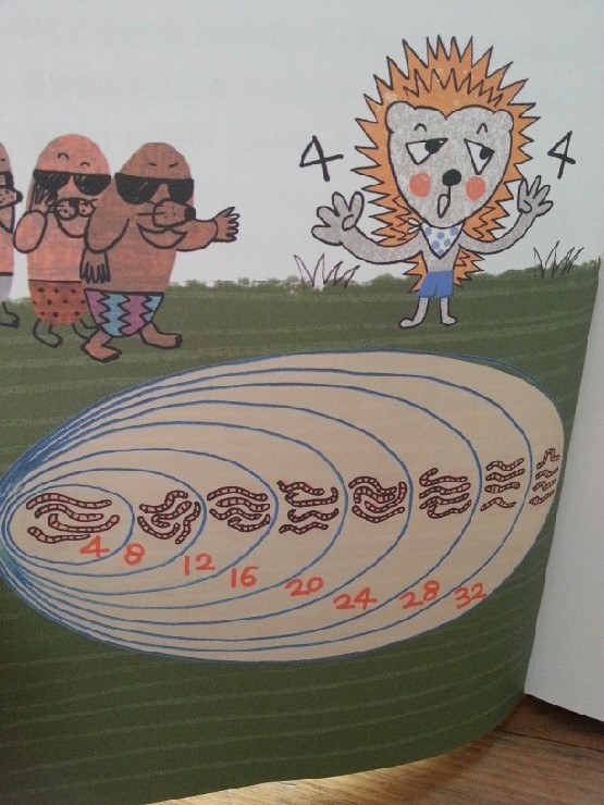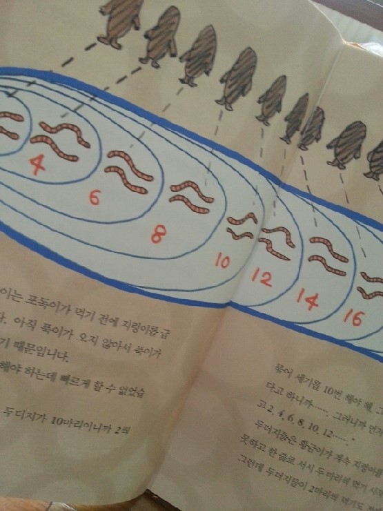 "지렁이를 2마리씩 먹으면 두더지가 10마리이니까 2씩 묶어 세기를 10번 해야해. 그런데 포독이는 3마리를 먹는다고하니까 2,4,6,8, 10,12....