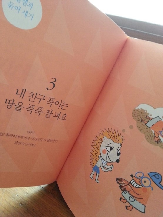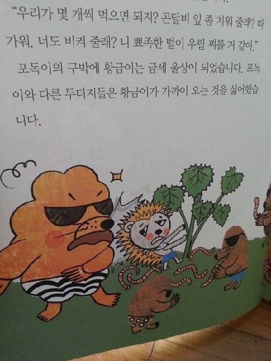 푹이는 코를 킁킁대며 황금이의 주위를 맴돌았는데 황금이는 쓸모없는 뾰족한 털을 가져서 나에게는 오지않는다며 풀죽은 목소리로 대답했다.