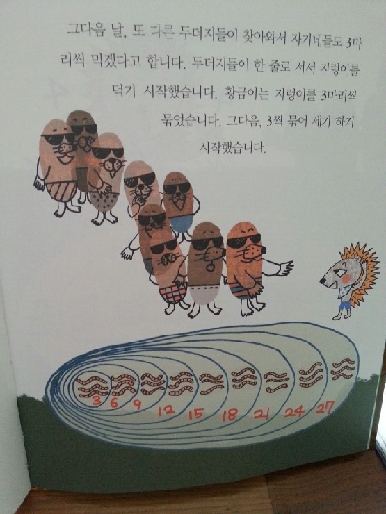 그다음날 다른 두더지들이 3마리씩 먹겠다고 하고, 황금이는 3마리씩 묶고, 그다음 3씩 묶어 세기 하기 시작했습니다.