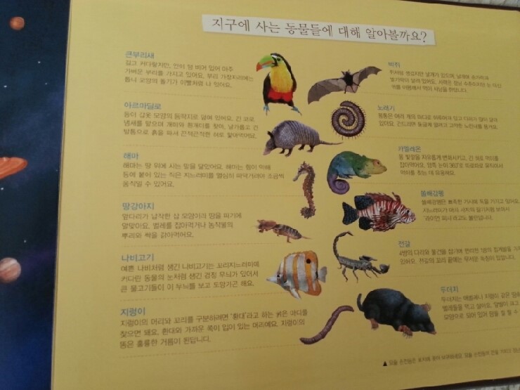 바다속 물고기들도 있고, 밀림속의 동물들, 어두컴컴한 동굴속에사는 동물들, 그리고 땅속에 사는 동물들에 대해서 하나씩 볼수있고 이름과 설명도 나와있네요.
