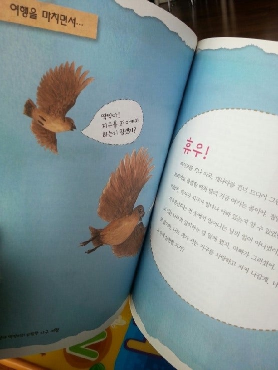 "딱딱아 우리는 오대양 중에 가장 큰 바다 태평양 위를 날고 있단다. 여기를 지나면 대륙이 나오지"