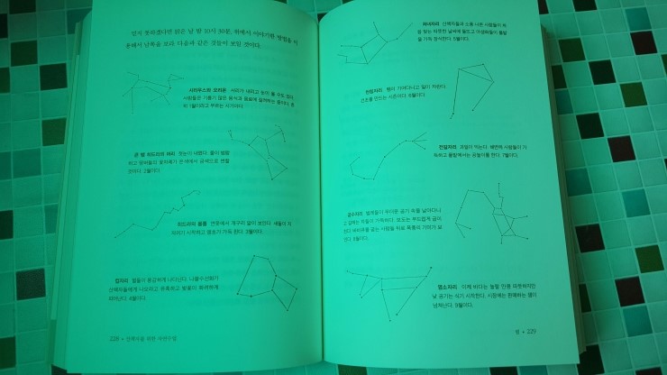 별에 대해서 소개할때는 별자리의 모양 그림을 주며 그것의 특징과 찾아보는 법을 알려주는데요.