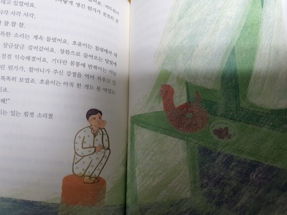 이퐁의 ‘호윤이와 뱀냥이’이야기는 지금의 코로나 이야기를 담고 있어서 더 가까이 다가온다. 호윤이는 엄마가 코로나에 감염되어서 외할머니 댁 바로 옆에 이모가 지은 집으로 자가격리를 하러 가게 된다. 할머니와 이모가 보살펴 주고 있어도, 얼마나 두려울지 짐작이 간다. 할머니가 문 앞에 둔 맛있는 곶감도 없어지고, 고양이 소리 같은 이상한 소리도 들린다. 호윤이는 또 없어진 쑥떡과 이상한 소리에 대해 친구 다미와 같이 이야기를 나누기도 한다. 그러다가 결국 만나게 된 뱀냥이. 고양이 얼굴을 한 뱀 같은 뱀냥이의 울음 소리가 편안했던 호윤이는 뱀냥이의 말도 알아 듣는다. 그렇게 뱀냥이와 편하게 이야기 하게 된 다음 날 드디어 아팠던 엄마와 드디어 통화를 하게 된다. 뱀냥이처럼 나를 위로해주는 무언가를 만난다는 것이 신기하고, 나를 지지해주는 어떤 존재가 얼마나 중요한가 생각하게 한다.