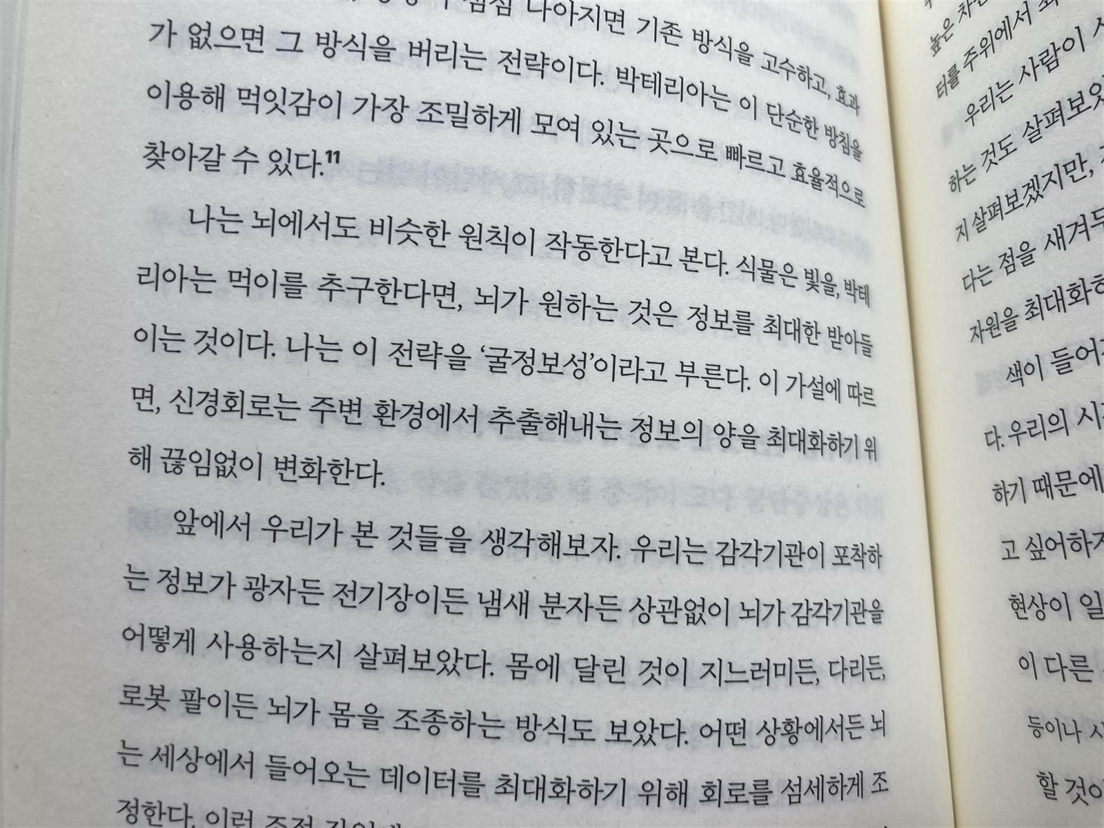 14.트록슬러 효과라고 불리는 이 환상은 주변부 시야에서 전혀 변화하지 않는 자극은 곧 증발하듯 사라진다는 사실을 보여준다. 왜 이런현상이 생길까? 우리의 시각 시스템이 항상 움직임과 변화를 찾으려하기 때문이다. 고정된 것은 곧 보이지 않게 된다. 좋은 정보는 업데이트해야 하지만, 변하지 않는 정보는 시스템이 무시해버린다. - P234