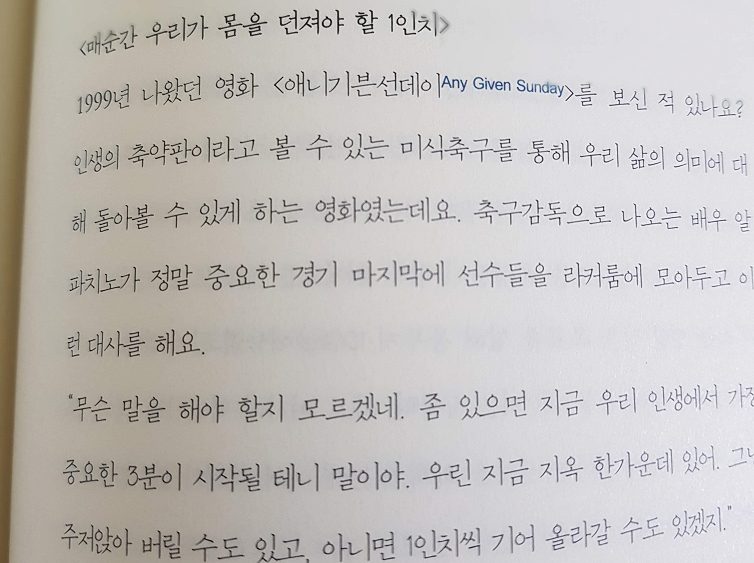 1999년 나왔던 영화 ‘Any Given Sunday, 1999’라는 미식축구 영화를 예를 든 본문에서는 느낌이 확 와닿습니다.