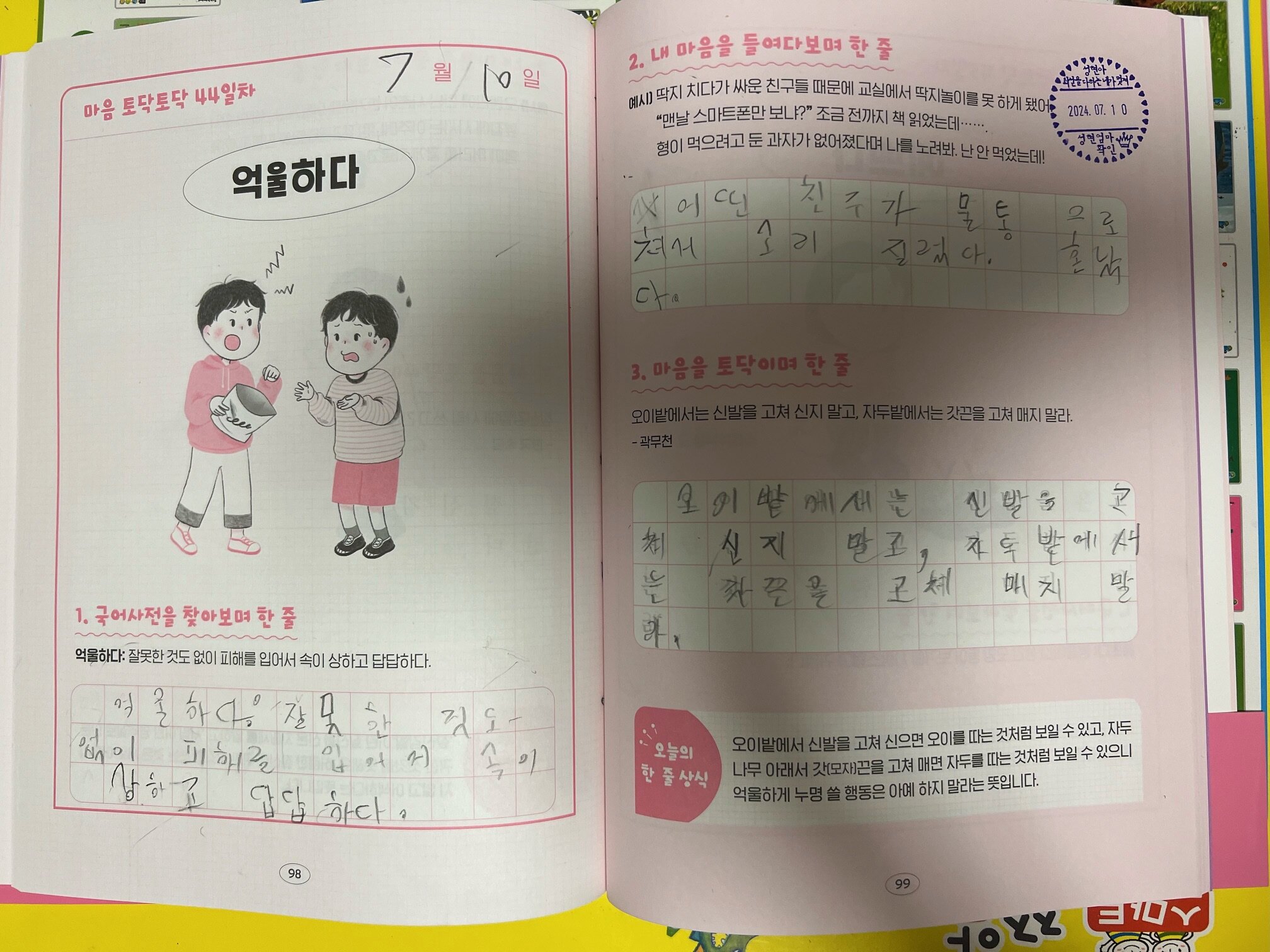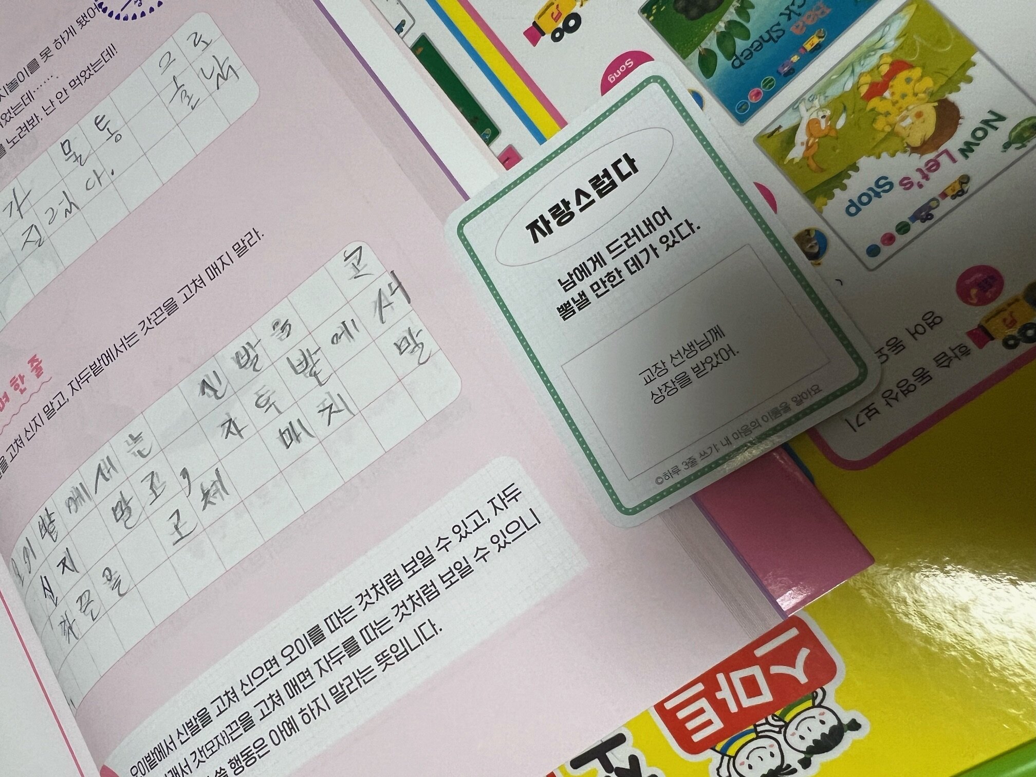 초1아이와 함께 해봤답니다. 본문을 여러번 읽으면서 이야기 나누고 쓰고 싶은부분을 적었어요. 아직 논리적인 글은 아니지만 나눈 이야기로 인해서 이런일이 있구니 라는 생각을 글로 표현 할수있어서 좋았답니다