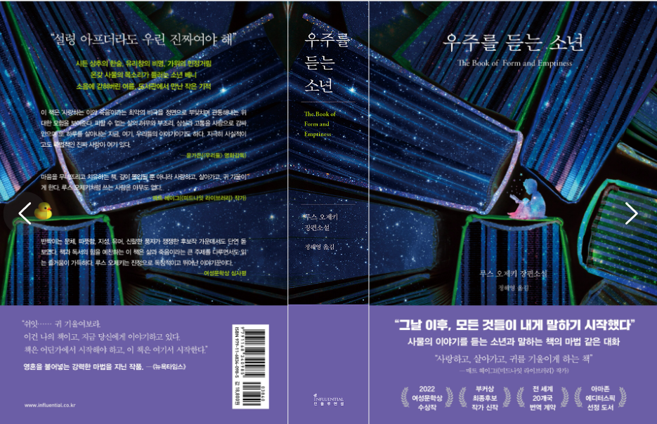 국내에서는 '우주를 듣는 소년'이라는 제목으로 출판되었지만, 2021년 바이킹에 의해 출판된 책 제목은 The Book of Form and Emptiness이다. 보이지 않는 것들의 책. 형태와 공허의 책이라고 해석할 수도. 소설은 사람마다 자신의 책이 있다고 한다. 여기서 말하는 책이 혹자는 영혼이라 표현하겠고, 자신의 또 다른 자아, 내 안의 천사라는 표현도 할 수 있다. 내면의 목소리. 그 소리를 들어 본 적이 있나? 나는 듣는다. 아주 가끔. 큰 시련을 겪고 나서나, 아주 고요히 온전히 나에게 집중하며 질문을 할 때. 첫 시작은 사춘기가 시작되는 중학생 때였던 것 같다. 그때는 내 안에 나를 사랑하고 염려하는 작은 또 다른 '나'라고 어렴풋이 생각했는데 뿌연 안개 같은 존재였다. 유명 강사들이 강연에도 내면의 소리를 듣는 이야기를 한다.