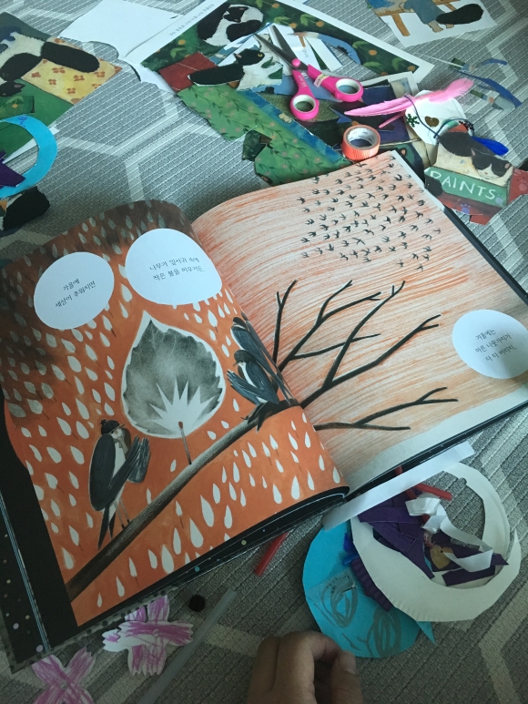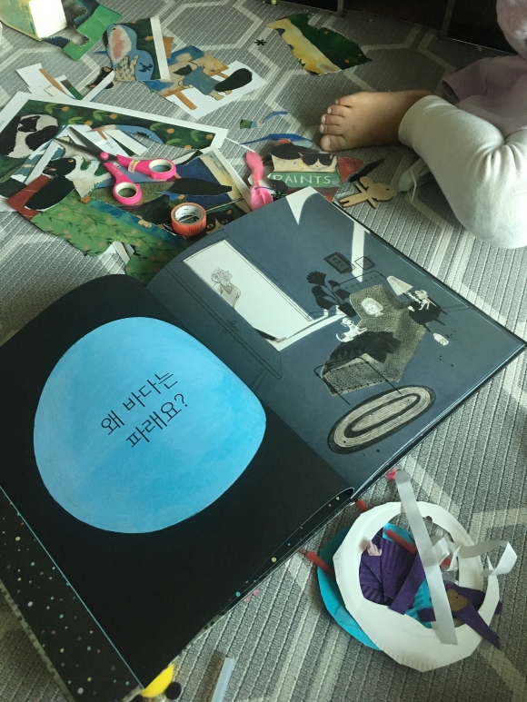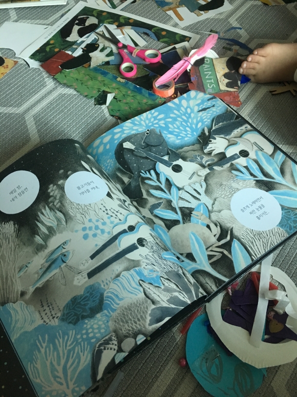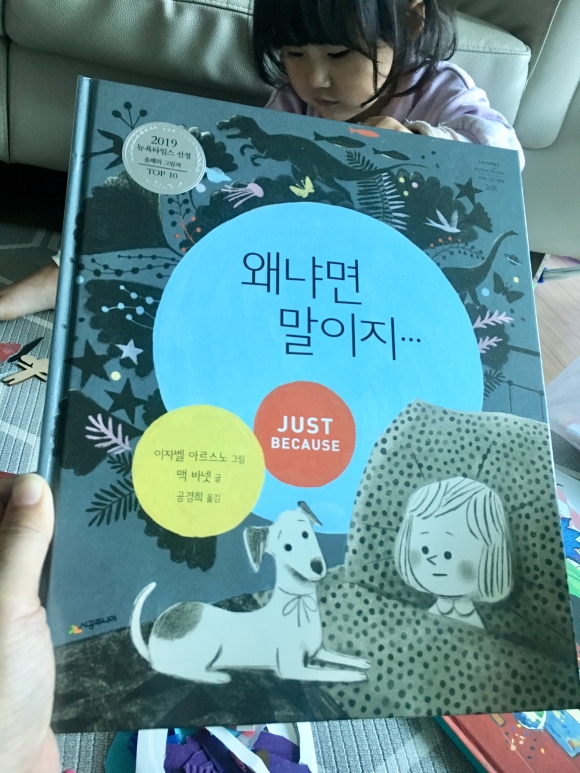 왜냐하면 말이지.....아이가 잠자리에 들기전 아빠에게 질문를 한다.왜 바다는 파래요? 질문하면 아빤 “매일밤 네가 잠들면 물고기들이 기타를 꺼내 슬프게 노래하면서 파란눈물을 흘린거야”하면서 다정스럽게 대답해준다. 아이는 아빠이런 대화를 통해 궁금한걸 하나씩 꺼내 놓는다.아빠는 다정하게 답을 다 해주고 마지막으로“이제 자야지”하는 말에 아이는“왜 자야 되는데요?”하면서 아빠는 나가면서.....왜냐면 말이지....눈을 감아야 보이는 것들이 있거든.눈을 감고 정말 보이는 세상,우리 아이들에게 상상의 나라에 초대하고 싶다. 5살 막내도 보면서 “엄마 왜 자야해?”하고 질문을 하는데...“눈을 감으면 보이것들이 있어”했더니....“엄마 안보여. 깜깜해ㅠㅠ”하면서 그림책을 덮어버렸다.아직 우리 딸아이는 상상의 나라에 안 가봤나보다 히힛.엄마랑 눈을 감고 상상의 나라로 가보자!