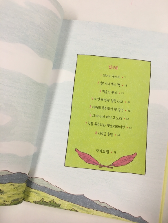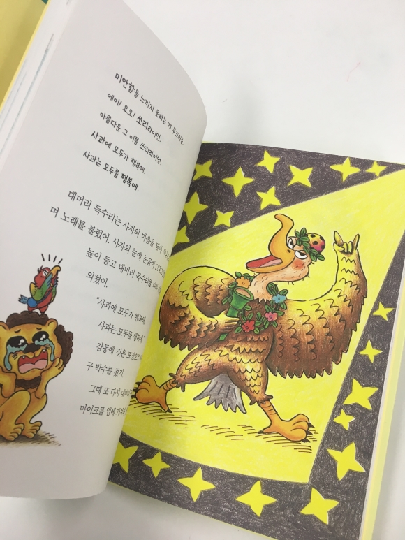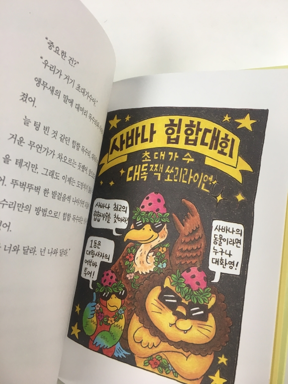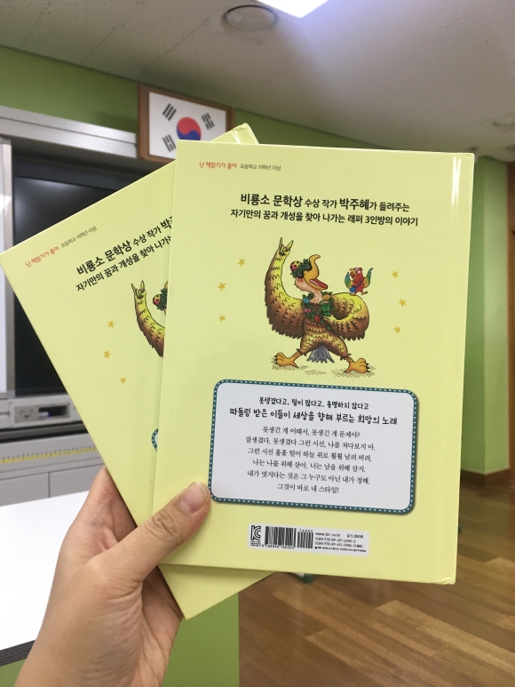 #힙합독수리#박주혜글 #유설화그림 #비룡소“못생겼다.”라는 이유로 많으 친구들에게 놀림받고 외면 받던 대머리 독수리가 자신과 비슷한 처지에 있는 친구들을 만나면서 자기 자신을 찾아 성장 하는 대머리독수리 이야기이다.대머리독수리와 수다쟁이 짹, 미안해병에 걸린 사자가 만나 “힙합독수리와 짹쏘리 라이언”이라는 그룹을 만들어 친구들에게 초대장을 보낸다.힙합독수리와 짹쏘리랑이언은 그들이 당한 부당함을 자기생각을 표현 할 수 있는 힙합으로 만들어 불렀다.대머리독수리는 외모, 수다쟁이 앵무새, 미안해병에 걸린사자가 자신들의 이야기를 힙합으로 이야기하는데 꼭 힙합 공연을 본듯한 기분이 든다. 나도 모르게~아’ 에이! 요오! “손 머리 위로!” 하면서 힙합처럼 이야기하면서 읽게 된다.이 책은 읽으면서 아이들은 또래 집단에서 남들과 다르면 아이들에게 놀림을 받는다. 다름을 인정하고 자기만의 특징을 잘 살려 앞으로 살아갈때 도움이 됐으면 좋겠다는 생각이 든다.