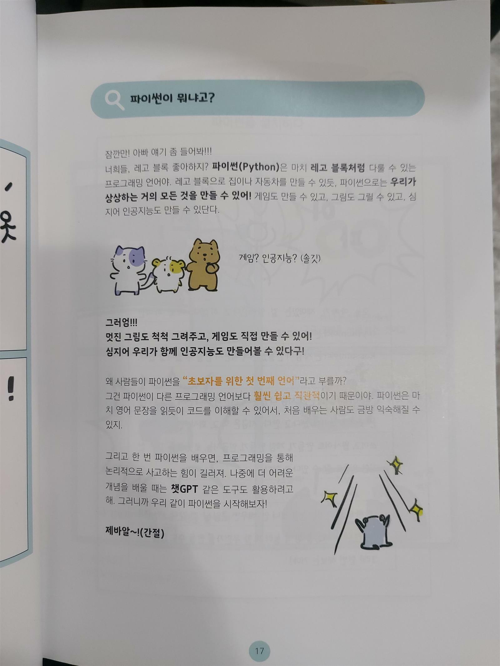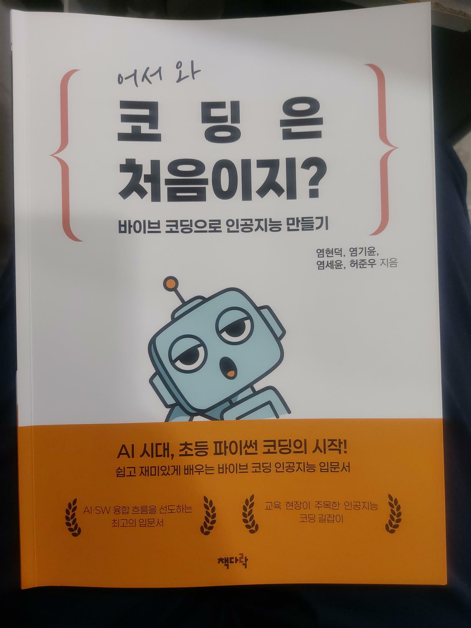 이 글은 출판사로부터 책을 제공 받고 작성한 리뷰입니다 어서 와 코딩은 처음이지? 바이브 코딩으로 인공지능 만들기 염현덕 외 / 책다락 최근에 읽은 바이브코딩 책이 두 권이 있었는데 외서 번역본이라서 기준이 좀 달라 그런지 이번 책만 못했다. 이번에 읽은 바이브코딩 책이 초보자의 눈높이를 가장 잘 맞춰주고 단계적으로 설명을 해주어 바이브코딩에 대한 이해와 관심도를 자연스럽게 개선시켜주었다. 아울러 파이썬의 기초코딩을 다뤄주었고 파이썬 코딩에 대한 추가적인 관심도 가지는 계기가 되었다. 아빠가 아이 셋에게 알려주며 대화식으로 풀어나가니 읽기에도 흐뭇하고 깨알같은 재미도 있어 좋았다. 처음에는 출력을 위한 명령어를 시작하여 클래스(객체 지향), 도구 불러오기, 터미널, 라이브러리, 바이브코딩 순서로 직접 파이썬과 파이톤설치 방법과 코딩구문을 올려주고 연습문제도 제안하면서 실습을 해볼 수 있도록 잘 구성이 되어있다. 특히 바이브 코딩시에 프롬프트 다루는 5가지 법칙은 매우 유용한 팁이라 코딩 외에도 다 적용이 되니 꼭 활용해봐야 할 대목이다. 그동안 코딩에 부담을 가졌던 사람들도 파이썬코딩을 접하면 다소 누그러질 듯하다. 또한 이 책과 같은 스타일로 구성된(인공지능 코딩길잡이, 부모가 아이에게 알려주는, 선생님이 제자에게 가르치는 서술 방식)서적을 추천하고 싶다. 생성형ai는 사람이 만든 사람의 보조역할을 위해, 충실히 임무를 수행하는 인공지능 프로그램이지만 가지고 있는 특성 중 하나는 배움이 가능하다는 점이다. 머신러닝이라 하는데 세분화하면 딥러닝, 하이브리드학습, 진화학습 강화학습이 가능하다. 그래서 앞으로도 더 나은 인공지능을 보게 될 가능성이 높다. 바이브 코딩을 하더라도 사람이 최종으로 수정및 보완을 하는 식으로 활용하면 가장 베스트일 듯 싶다. 코딩언어가 처음이라면 파이썬부터 한번 배워보면 어떨까.