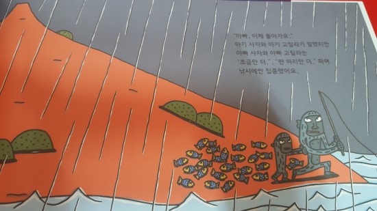 비가 오기 시작하는데도 상대를 의식하며 물고기를 더 많이 잡는데에만