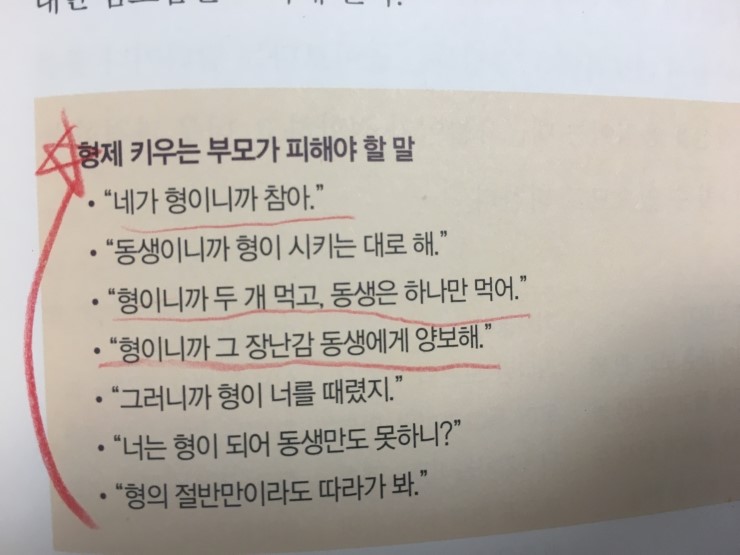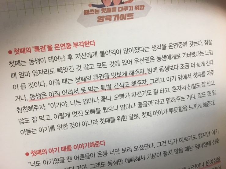 - 동생이 첫째의 물건을 망가뜨리거나 첫째를 귀찮게 괴롭힐때 '아기니까 봐주자' 라고 첫째에게 요구해선 안된다.