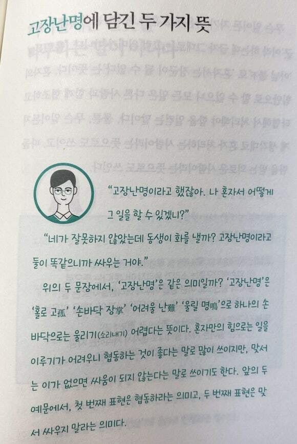 일상생활에서 자주 쓰이는 사자성어들 정확한 한자 의미와 잘못 알고 있었던 사자성어들도 찾아볼 수 있어서 읽는 내내 흥미로웠고 이런 상황에서는 어떤 단어가 자주 쓰이는지 어떨 때 병이 오는지에 대한 기초지식도 쌓을 수 있어서 좋았어요