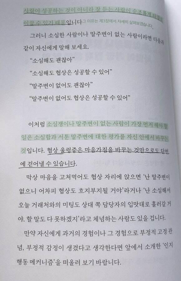'말을 잘하는 사람이 성공하는 것이 아니라 잘 듣는 사람이 순조롭게 타결로 이끌 수 있기 때문에 소심한 사람들이 가장 먼저 해야 할 일은 소심함과 서툰 말 주변에 대한 평가를 자신 안에서 바꾸는 것입니다'