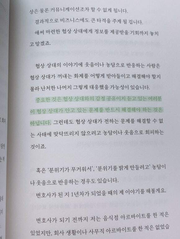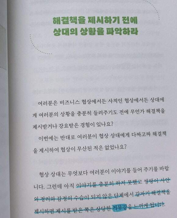 협상은 비즈니스뿐만 아니라 일상 사적인 공간에서도 적용이 되는데 과거의 부정적인 기억이나 고정관념의 틀에서 벗어나 상대의 말을 경청하며 상대가 원하는 말이 무엇인지 파악하고 이해한 뒤 공감 후 대화를 이어나가야겠어요~