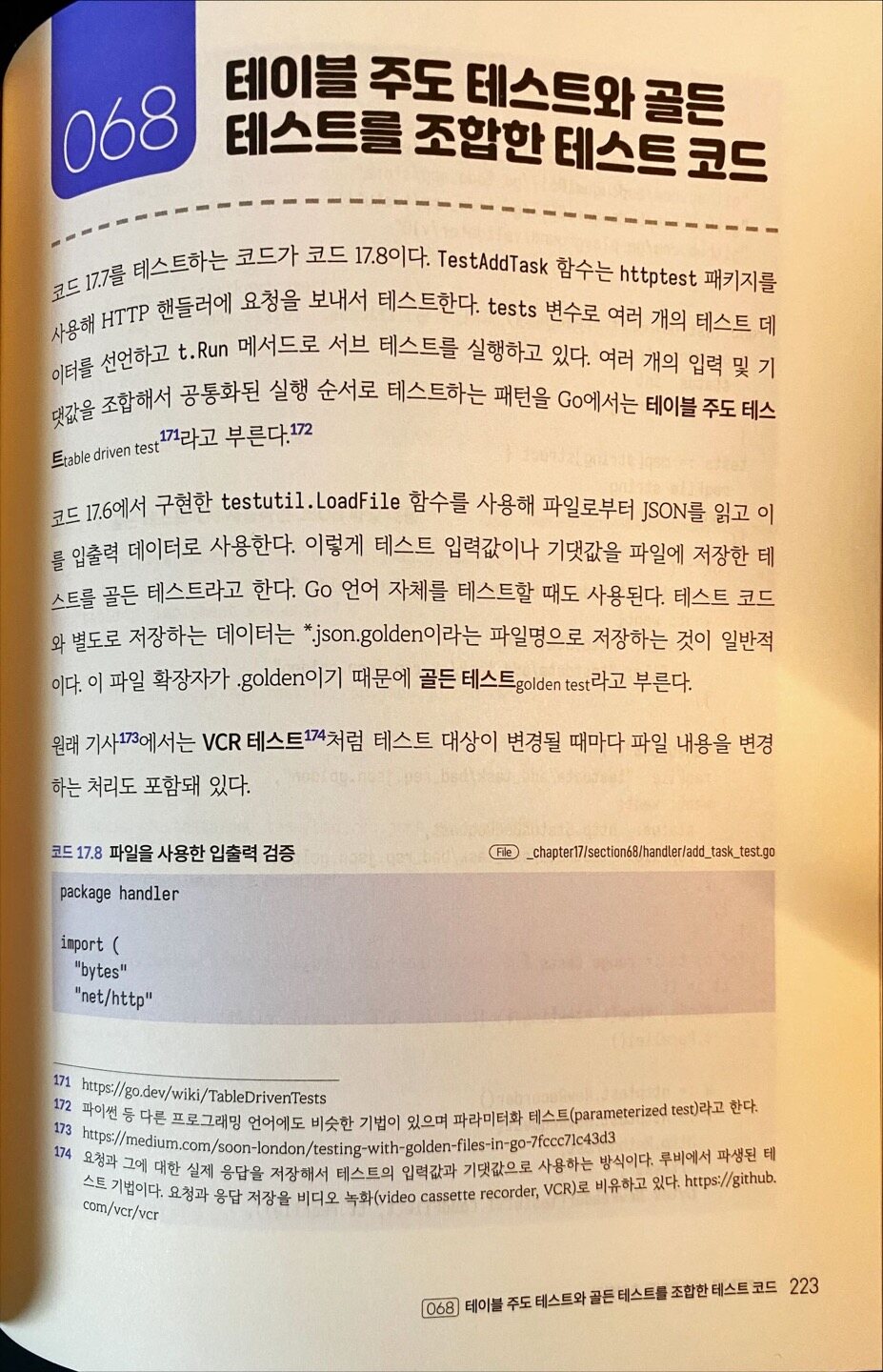 이 책에서 또 마음에 들었던 부분은 웹 개발을 테스트 코드를 짜면서 진행한다는 것이다. 사실 TDD에 대한 많은 얘기가 있고 본인 필자도 TDD를 그렇게 반기지는 않지만, 적어도 자신이 작성한 코드에 대해서 테스트 코드를 짜봐야 한다는 점은 동의한다. 이 책은 웹 개발을 진행하면서 테스트를 같이 작성하면서 개발을 진행하기 때문에 Go를 통한 웹 개발과 테스트에 대한 중요성을 동시에 알 수 있을 것이다.