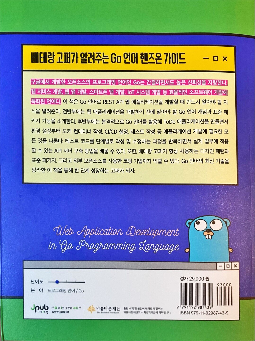 주로 스프링을 업무에서 활용하다보니 자바 이외의 다른 언어로 개발할 기회가 흔치 않았는데, 제이펍에서 이번 서평단 이벤트로 Go라는 언어로 웹 기반의 개발을 경험해볼 수 있었다.