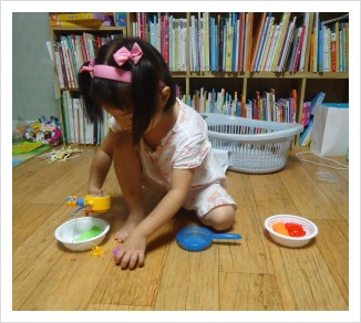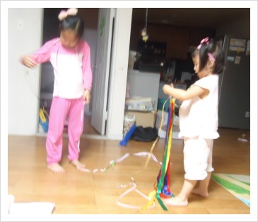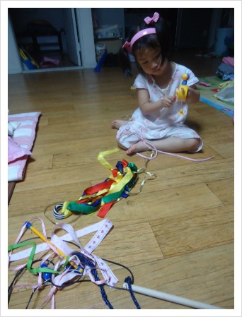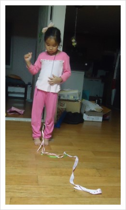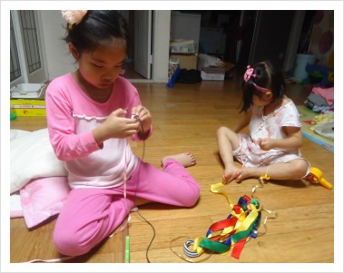 작은 아이도 낚시줄까지 이용하여 언니보다 더 길게 줄을 이어보겠다고 도전합니다.