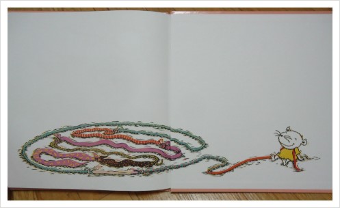 만나는 동물들마다 줄을 가지고 등장하며 짧은 단어, 여백의 미를 살린 단순한 그림과 함께
