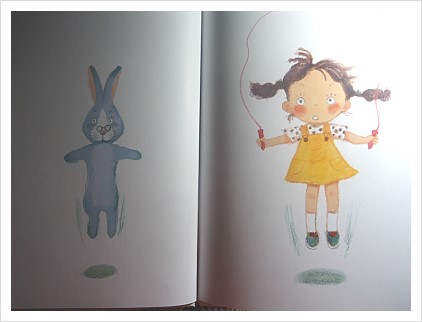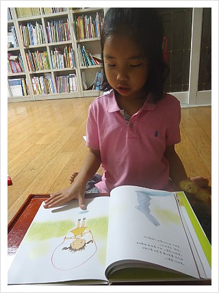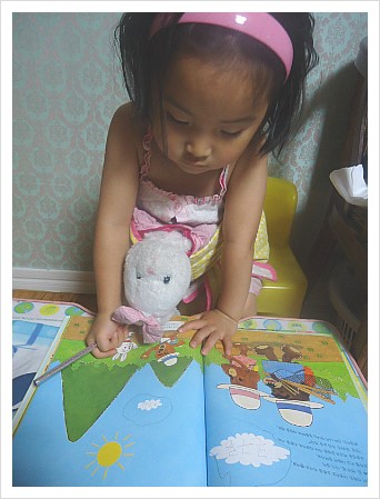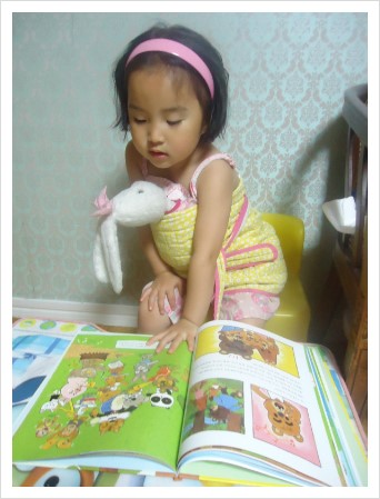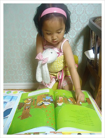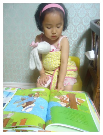 엄마에게 책을 읽어주겠다며 가장 좋아하는 토끼를 앞으로 안고, 열심히 그림을 보면서 엄마에게 책을 읽어주는 딸.