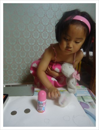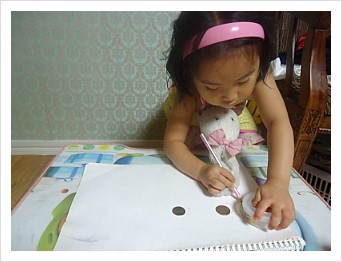 아이랑 500원, 100원짜리 돈과 동그란 통을 이용하여 동그라미를 그리고 크다, 작다의 개념을 알려주었어요.