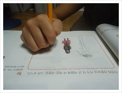 큰 구름에 야무지게 연필을 잡고 큰 구름에 동그라미하고 있어요.