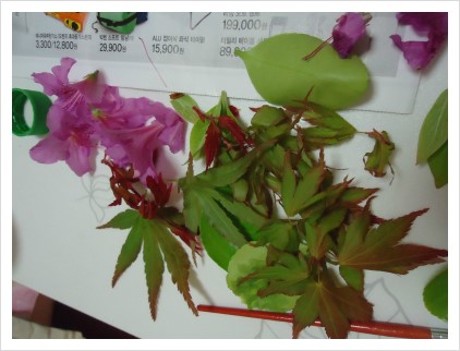 얼마전 사놓은 화선지에 대표적인 봄꽃 진달래와 단풍나무와 푸른 잎으로 색을 표현해 봤습니다.