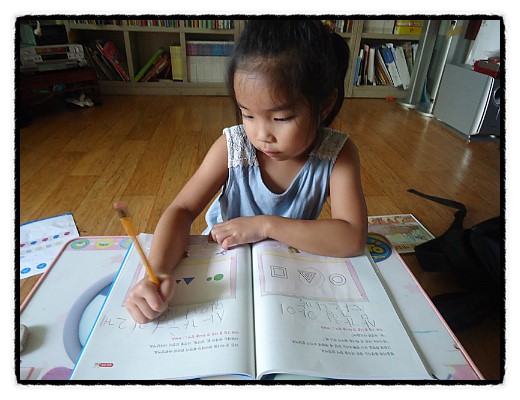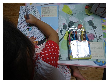 책상에 앉아서 예쁘게 나비 날개에 색칠해주는 우리 딸.