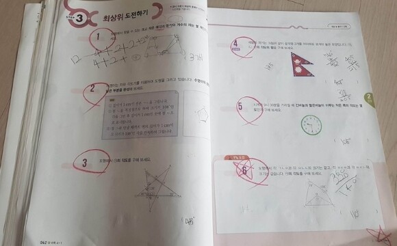 4학년쯤 오면 그 조건을 가지고 나머지 한각을 구하고, 또 삼각형을 만들거나 사각형을 만들어서