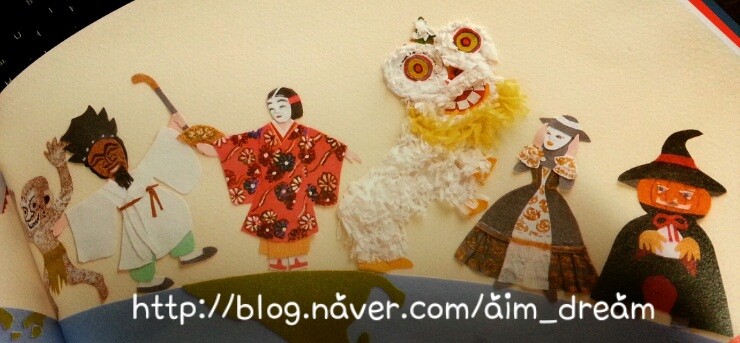 그래도 그림은 참 재미있다. 아이 역시 여러 가면을 재미있게 감상했다. 작가가 직접 종이를 오려서 조물락 조물락 가면들을 다 표현해 놓아서 보는 눈이 즐겁다. 종이를 돌돌 말기도 하고, 종이를 갈기갈기 찢어서 표현하기도 하는데 그런 부분은 그대로 응용해서 아이 미술 놀이에 적용하면 좋을 것같았다.