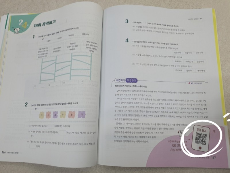 초코국어를 보면서 느끼는 거지만, 확실히 타 출판사 대비 QR코드를 통한 강의나 문제들이 앞서 나가는 거 같아요. 보통 아이들이 문제를 푼 것은 다시 보질 않잖아요. QR코드는 복습하기에 진심으로 최고인 거 같아요