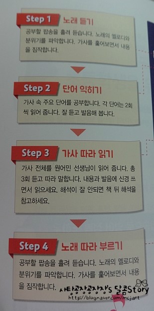 노래듣고 ----> 어휘 익히고----> 가사 따라 읽고----> 다시 노래 부르기 코스로 4단계 기본 학습하며