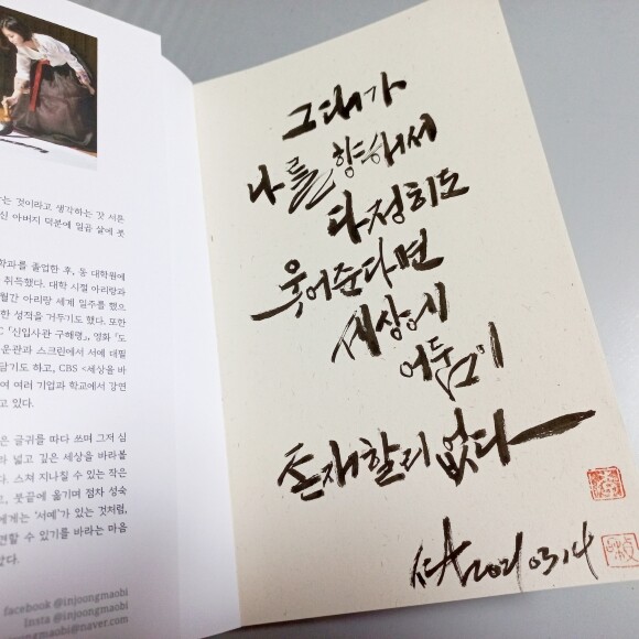 유행에 휩쓸리지 않는 길, 한 순간에 인기있었다 사라지는 길이 아닌, 오랜 시간 공들여야 하는 이 길을 묵묵히 걷고 있는 저자가 참 아름답게 보인다. 실제로 표지의 한복입은 저자의 모습은 너무도 단아하고 딱 서예 예술가의 이미지가 고스란히 전해진다.