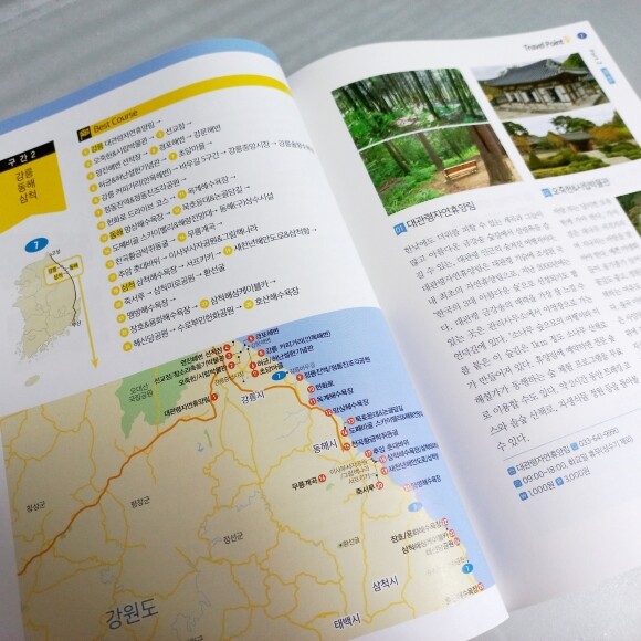 고속도로 구간별 지도를 따라 여행 동선이 표시가 되어 있어서 여행의 전체적인 그림을 그려볼 수 있고, 각 지역의 대표 관광지에 대한 운영시간, 입장료 등등 상세한 정보 덕분에 일일이 인터넷으로 검색해야 하는 수고를 덜 수 있다.