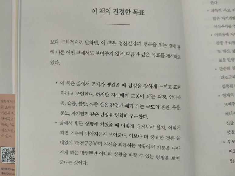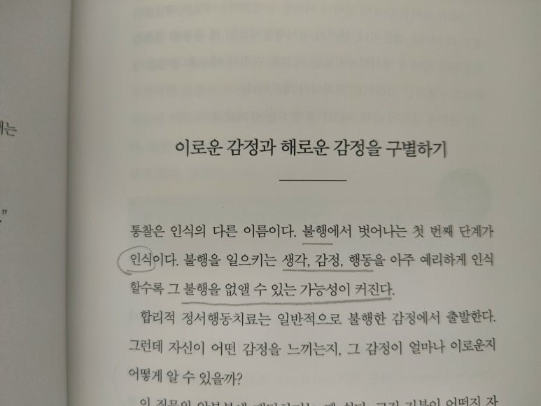 불행에서 벗어나는 첫 단계가 인식이고, 불행을 일으키는 생각, 감정, 행동을 제대로 인식할수록 그 불행을 없앨 수 있다고 한다.