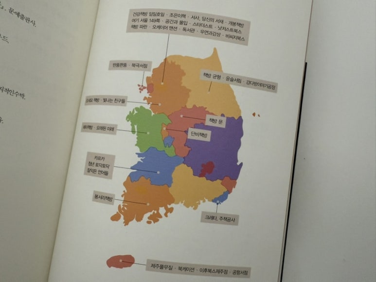 누가 알려주지도 않았는데 지역 별로 나눴을 거라고 생각한 건 그저 내가 단순하기 때문이었다. 목차를 보니 독립서점 34곳을 쉼, 여행, 소통, 생각의 공간으로 나눠 소개한다.