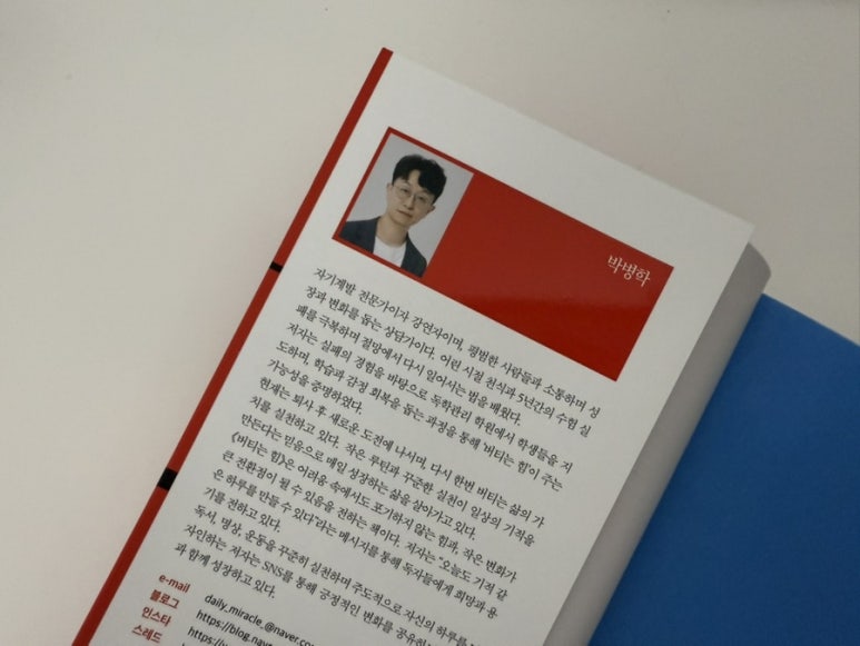 천식으로 고생했던 어린 시절과 실패로 끝난 5년간의 수험 생활을 담담히 얘기한다. 실패의 끝에서 어떻게 다시 삶에 활기를 불어넣었고 스스로 일어섰는지 경험에서 얻은 노하우를 풀어냈다.