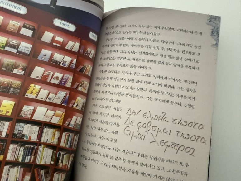 크레타 서점은 바다가 있는 부산에 위치하고 있다. 책 속에 있는 그리스어는 책장 옆에 있다고 하는데 소설가 니코스 카잔차키스의 '그리스인 조르바'에 나오는 내용이라고 한다.
