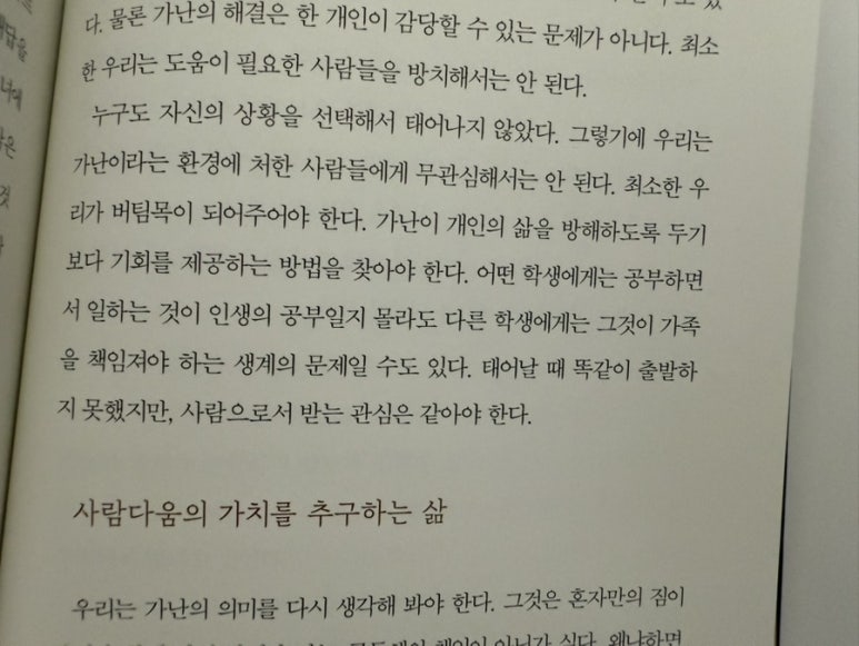 부모가 가난하면 아이들은 가난할 수밖에 없다. 본인의 선택이 아닌 필연이다. 이런 가난은 어린아이들이 받아들이기에는 형벌과 같다. 가난이라는 환경에 처한 사람들에게 관심을 가지고 버팀목이 되어주어야 한다고 저자는 강조한다. 공부하며 일하는 것이 어떤 아이들에게는 생계의 문제일 수 있다. 우리 가족뿐 아니라 어렵게 사는 사람들에게도 관심을 돌려야 한다고 소리 높여 이야기한다.