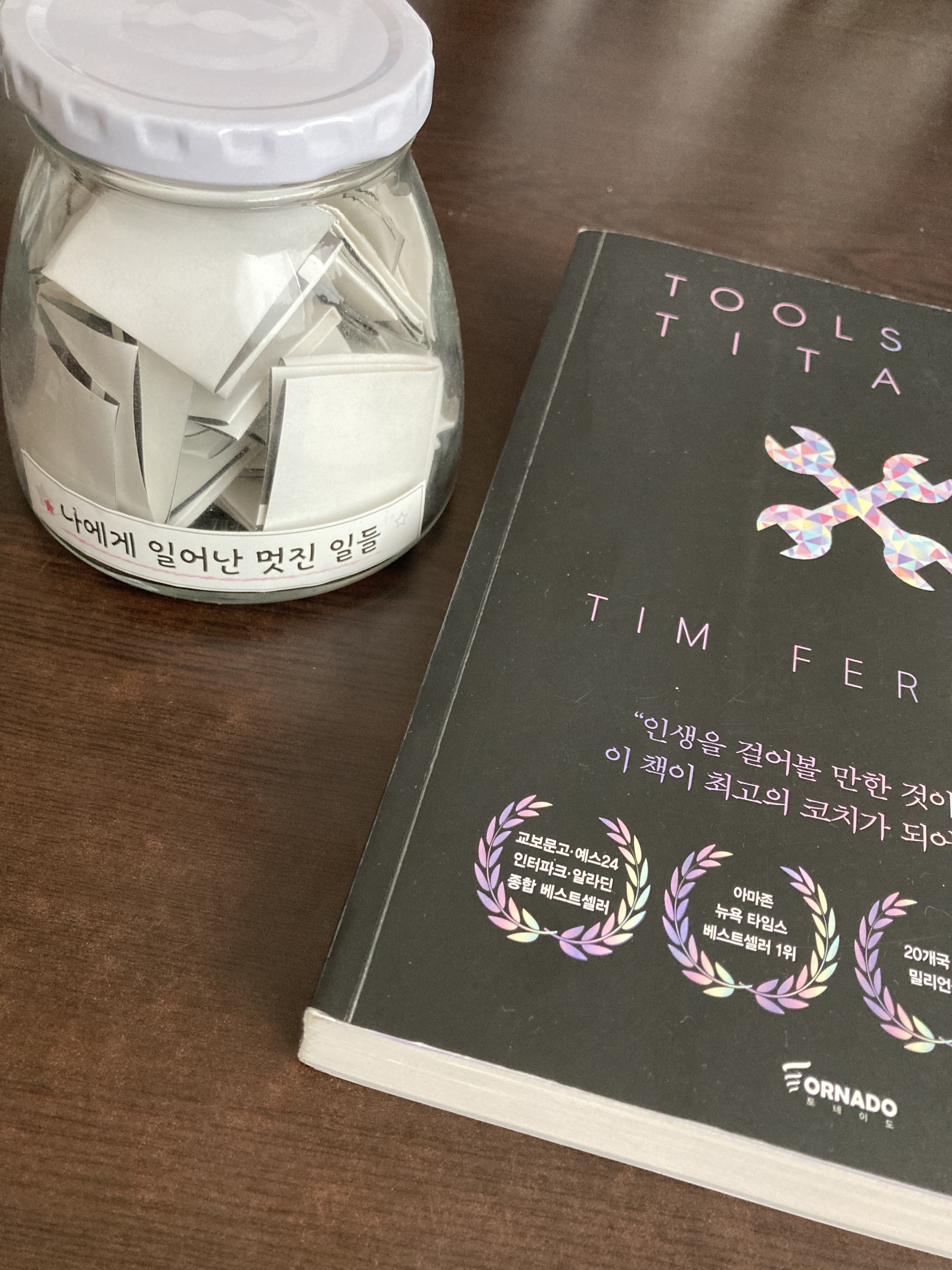 작가님이 『타이탄의 도구들』을 읽고 기분 좋았던 일, 멋진 일을 적은 종이를 유리병에 넣을 거라는 내 글에 댓글을 달아주셨다. 본인이 실천했던 사진을 첨부했는데 어쩜 라벨링까지 이쁘고 정성스럽다.