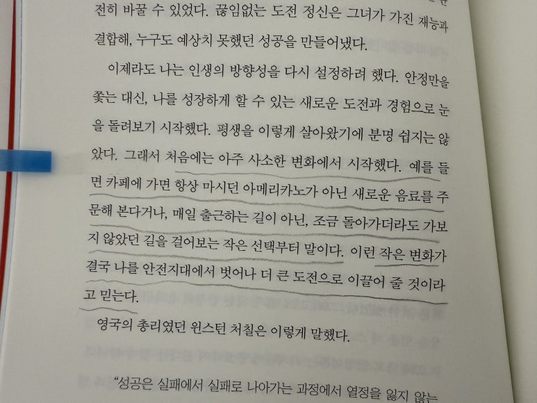 아주 사소한 변화에서 시작해라. 카페에 가서 항상 마시던 메뉴 말고 새로운 음료를 주문해 보고, 매일 가는 길이 아닌 조금 다른 길을 걸어봐라. 작지만 이런 변화가 안전지대를 벗어나 새로운 도전으로 이끌어 줄 것이다.