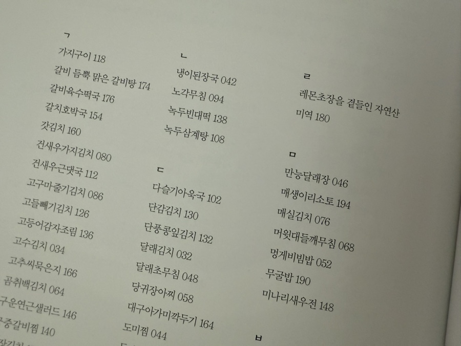 제철 재료를 이용한 반찬 만드는 법을 봄, 여름, 가을, 겨울로 나눠서 소개한다. 제일 뒷장에 초성으로 레시피를 찾아볼 수 있도록 index가 있다.