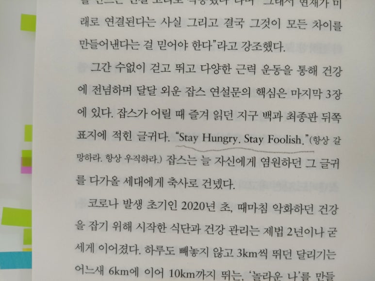 "Stay Hungry, Stay Foolish" (항상 갈망하라. 항상 우직하라.)