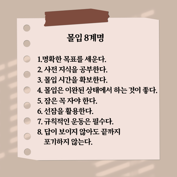 몰입 상태 들어가는 것과 유지하는 것 모두에 큰 도움이 되므로 규칙적인 운동이야말로 몰입적인 사고에 가장 중요한 조건이라고 강조한다.