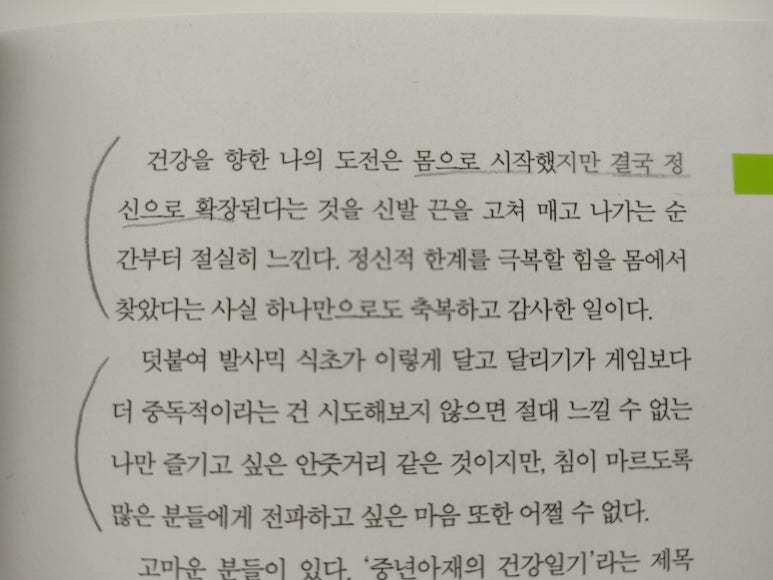 건강을 향한 나의 도전은 몸으로 시작했지만 결국 정신으로 확장된다는 것을 신발 끈을 고쳐 매고 나가는 순간부터 절실히 느낀다.