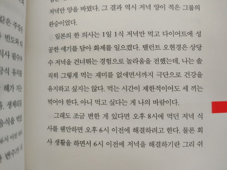 결론은 마지막 식사는 되도록 빨리 먹으라는 것이다. 6시에 밥 한 공기가 8시에 먹는 밥 반 공기보다 낫다. 퇴근하고 집에 와서 밥을 먹으면 보통 8시가 넘어가기 십상이다. 결국 회사에서 먹어야 6시 전에 먹을 수 있겠다. 저녁을 안 먹으면 되겠지만 나 또한 하루 세 끼는 꼭 먹어야 하기 때문에 일찍 먹으려는 노력을 할 테다.