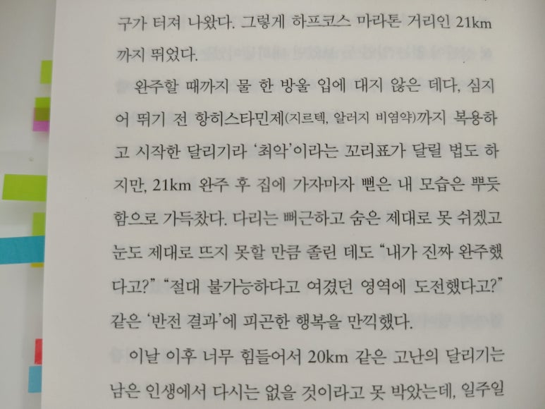 21Km 완주 후 불가능하다고 여겼던 영역에 도전해서 이뤄냈다는 뿌듯함을 선물받았다. 피곤한 행복을 만끽했다는 구절에 공감 백배