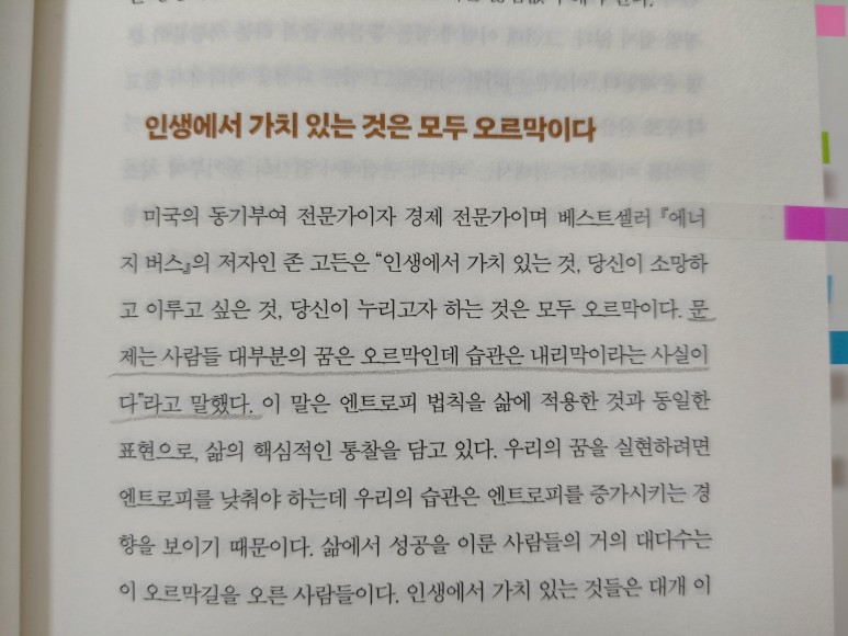 우리의 꿈을 실현하려면 엔트로피를 낮춰야 하는데 우리의 습관은 엔트로피를 증가시키는 경향을 보인다고 해서 괜히 찔리기도 했다.