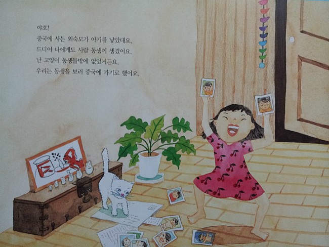 고양이 동생만 가지고 있었던 아이에게 외숙모가 낳은 동생이 생겼어요.
