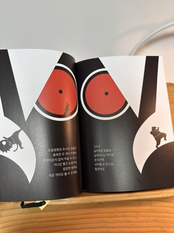"아무도 한 번도 본 적 없는 무서운 괴물이 사는 과일정원이에요" 라고 읽을 때쯤에는